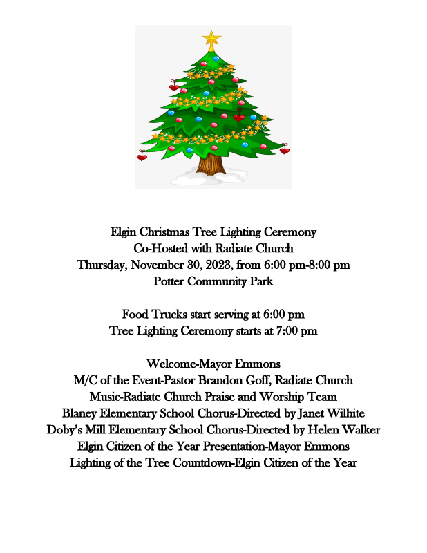 The Town of Elgin Annual Tree Lighting Ceremony will be held the Thursday before the Catfish Stomp, November 30, 2023 at Potter Park!