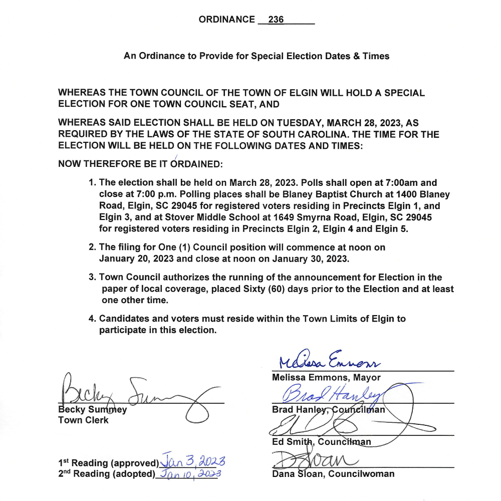 Town Council of the Town of Elgin will hold a special election for one Town Council seat.